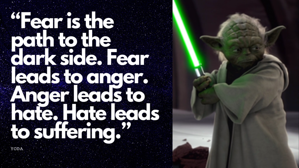 “Fear is the path to the dark side. Fear leads to anger. Anger leads to hate. Hate leads to suffering.” ~ Yoda